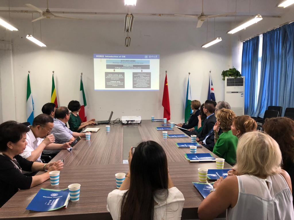 yl6809永利官网院长兼书记叶苗教授首先对意大利访问团来访表示热烈欢迎,简要介绍了yl6809永利官网的国际学生教育和yl6809永利官网的基本情况。叶院长就永利官网开设的课程、长短期项目、学生活动、奖学金等总体情况进行了详细介绍。她指出,温大历年来都将华文教育作为联结海外侨胞、展示中华文化、彰显温州国际形象的重要纽带。近年来,温州以瓯越文化为根基,将“请进来”与“走出去”相结合,在华文教师海外培训、华裔青少年夏令营活动等方面都取得了显著成效。