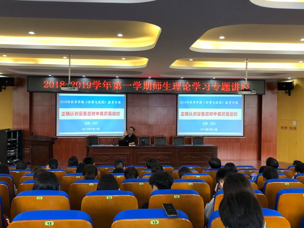 为正确认识现今中美贸易摩擦的来龙去脉,明确我国应对贸易摩擦的总体方针以及深入了解我国经济运行总体趋势和当前形势变化,永利官网于9月26日在北校区3号楼203报告厅举行了2018-2019学年第一学期师生理论学习专题讲座。此次学习由马克思主义学院蓝立志老师主讲。yl6809永利官网全体师生、体育学院教工参加。