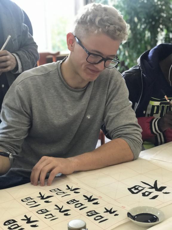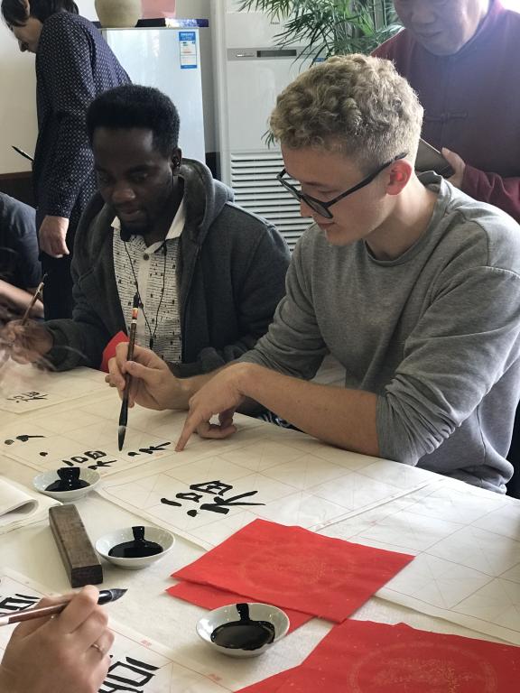 讲座开始,赵立新老师从中国书法的起源与种类入手,图文并茂,以循序渐进的方式带领大家一起探索中国书法的奥秘,体会传统文化的典雅韵味。讲解过程中,赵老师用丰富的肢体语言以及浅显易懂的板书激发国际学生的兴趣,大家听讲认真,回应积极,听完讲座后纷纷拿起毛笔踊跃动手实践。工作坊内文房四宝兼备,赵立新老师亲自执笔演示了不同字体的书写方法,下笔果决,字形正倚交错,粗细变化明显,尽显书法之魅力。在赵老师的帮助和指导下,同学们也拿起了毛笔,在红色宣纸上完成了自己的作品,稚嫩却又工整的书法中可见同学们对中国书法的喜爱。