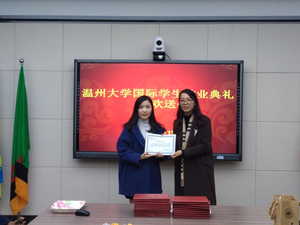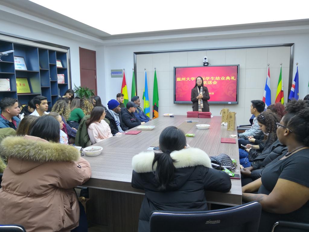 会上,张珉璐老师作为教师代表发言,她说,“很高兴在这里和你们相遇,并在这里共同成长,共同进步。”她列举了三个国外名人学习汉语的案例,激励国际学生们坚持不懈攻克汉语言难关,学说中国话。意大利籍交换生李马莲作为结业学生代表,用中文讲述了她在温大学习生活的切身感受。“刚来温大的时候,我对这里的饮食和气候还不熟悉,怀念意大利的家乡菜,但是后来竟慢慢爱上了这里,爱上了温州菜,经常和朋友出去品尝不同种类的特色美食”,李马莲说她参加了国际文化周、汉服文化体验等活动,“老师们也很善良,耐心教导我们每个汉字的含义,我衷心地感谢学校的领导和老师们。”她的同学许弘文说到,“我今年寒假就要离开温大回到意大利了,非常感谢学校和各位老师,在这里学习的经历将会给我一生中留下最难忘的回忆。”