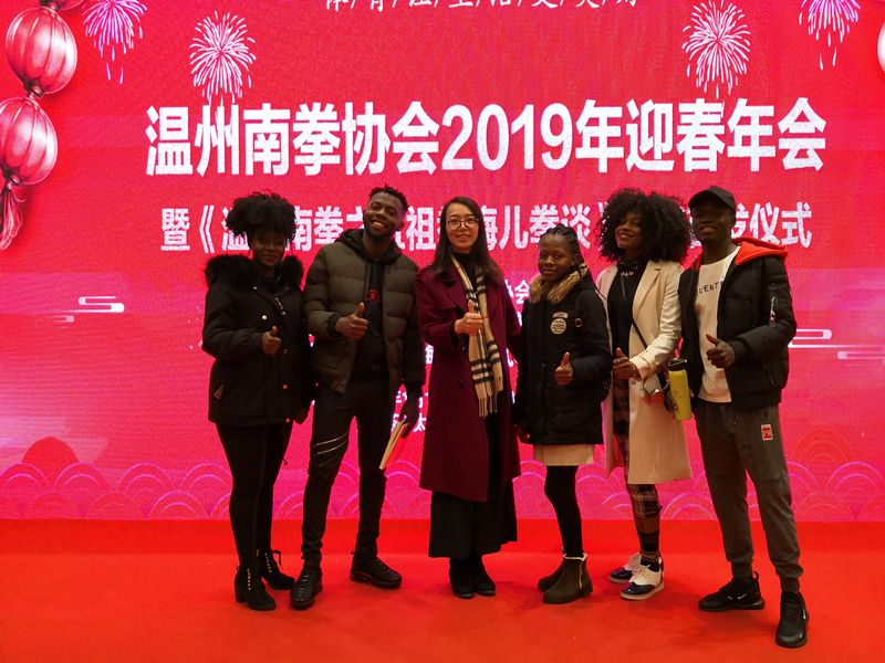 1月13日上午,温州南拳协会2019年迎春年会暨《温州南拳之五祖拳娒儿拳谈》首发仪式举行,来自尼日利亚的GADZAMA MADU ASINAMAI等国际学生为在场观众表演了非洲舞蹈及歌曲,充满活力的舞姿赢得在场观众的阵阵欢呼,歌曲《We Are The World》高低起伏,抑扬顿挫,意境丰富,引起观众的共鸣,也展现了国际学生的青春风采和多才多艺。