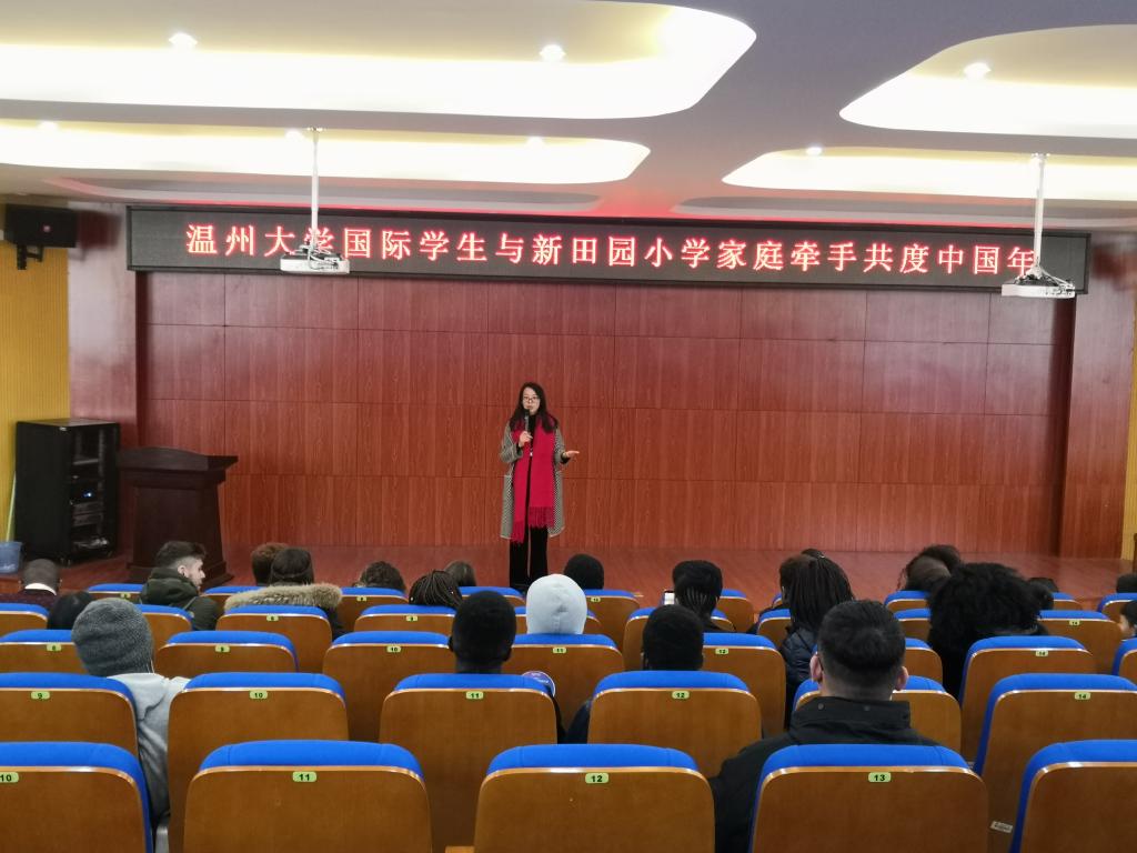 1月21日,我校国际学生与新田园小学家庭共度中国年活动在北校区3号楼203会议室举行。yl6809永利官网副院长包含丽、温州市新田园小学副校长洪艳、两校老师、新田园小学学生及其家长们、25名国际学生参加了此次活动。