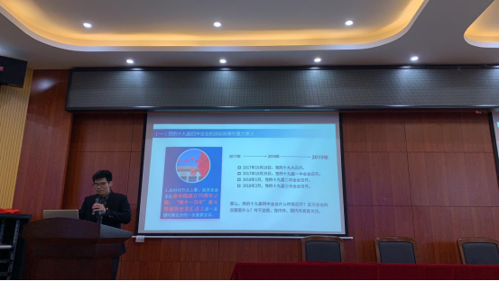 吴志敏老师结合中国近现代史和和中国共产党发展历史,用客观的事实,翔实的数据,深入浅出地阐述了党的十九届四中全会的会议精神。他说,十九届四中全会是全面建成小康社会、实现第一个百年奋斗目标迈进的关键之年召开的一次重要会议,全会充分肯定我们党治理国家取得的历史性成就,全面总结我国国家制度和国家治理体系的显著优势,明确了加强和完善国家治理必须坚持的基本原则以及总体目标、工作要求,为坚定制度自信、实现伟大梦想提供了根本遵循、指明了正确方向。