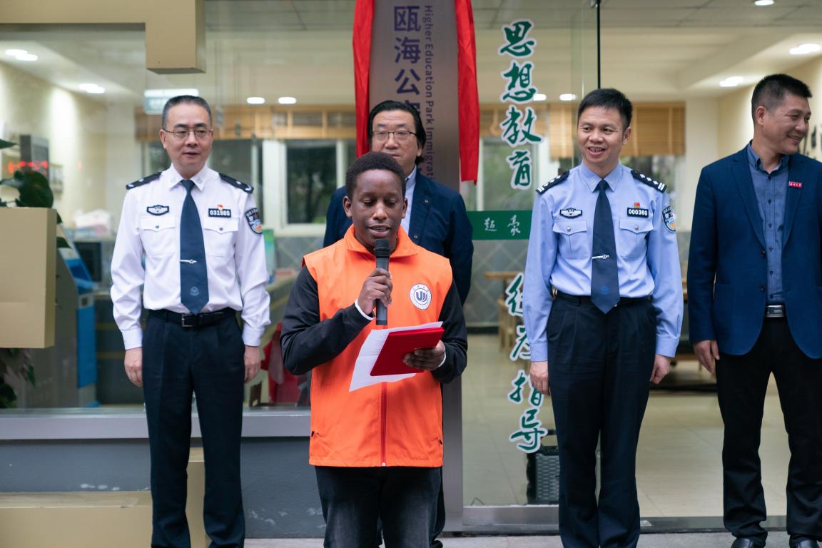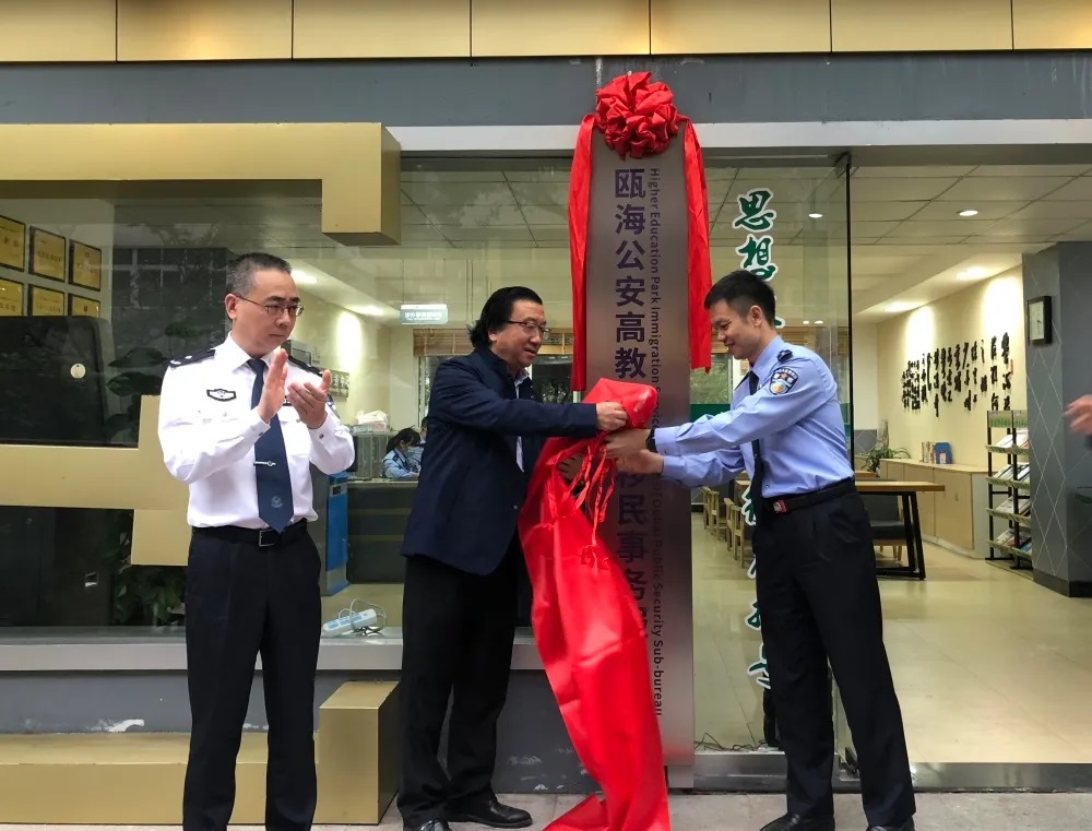 11月20日下午,瓯海公安高教园区移民事务服务站在yl6809永利官网正式揭牌成立。yl6809永利官网党委委员、副校长蔡曙光,瓯海区副区长、区公安分局局长吴仁伟,温州市公安局出入境管理局局长黄锦化、茶山高教园区派出所所长潘东瓯、yl6809永利官网保卫处处长孙安梭、yl6809永利官网国际交流与合作处副处长郑婷、yl6809永利官网党总支书记林爱菊、副书记方建晓等领导共同参加揭牌仪式。参加揭牌仪式的还有温州市出入境、茶山派出所相关民警,yl6809永利官网相关教师,高教园区首批受聘留学生志愿者。仪式由区公安分局党委委员、副局长郑裕军主持。