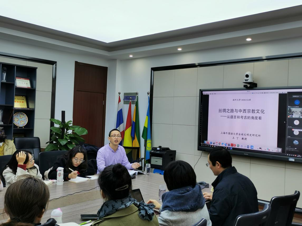 2020年12月8日下午2:00,上海外国语大学王丁教授通过腾讯会议为我们带来了题为《丝绸之路与中西文化交流——从语言和考古的角度看》的线上讲座。yl6809永利官网叶苗院长、林爱菊书记、熊勇副院长,部分专任教师及2020级汉语国际教育专硕点全体学生参加了这场讲座。讲座由专任教师叶晓锋博士主持。