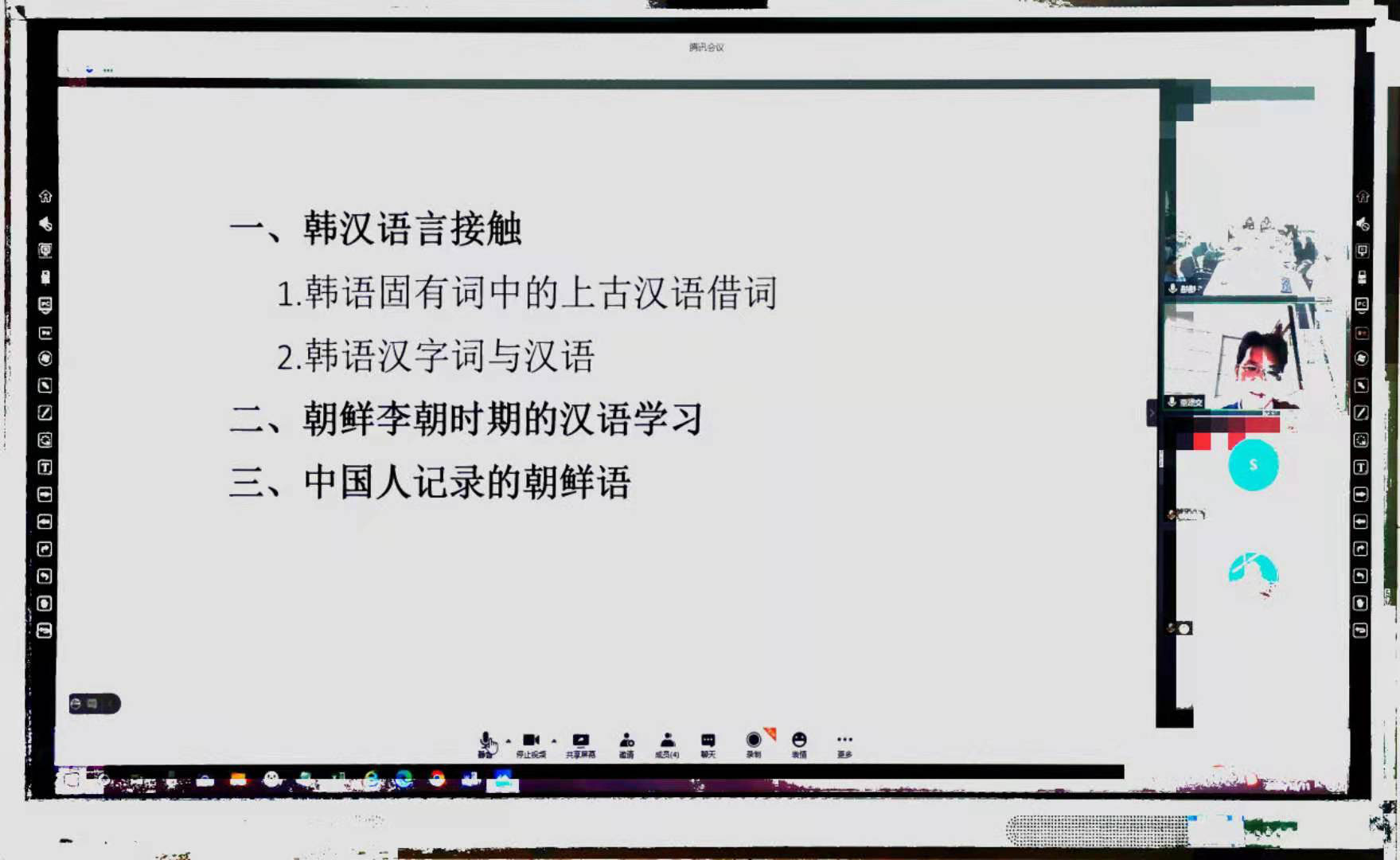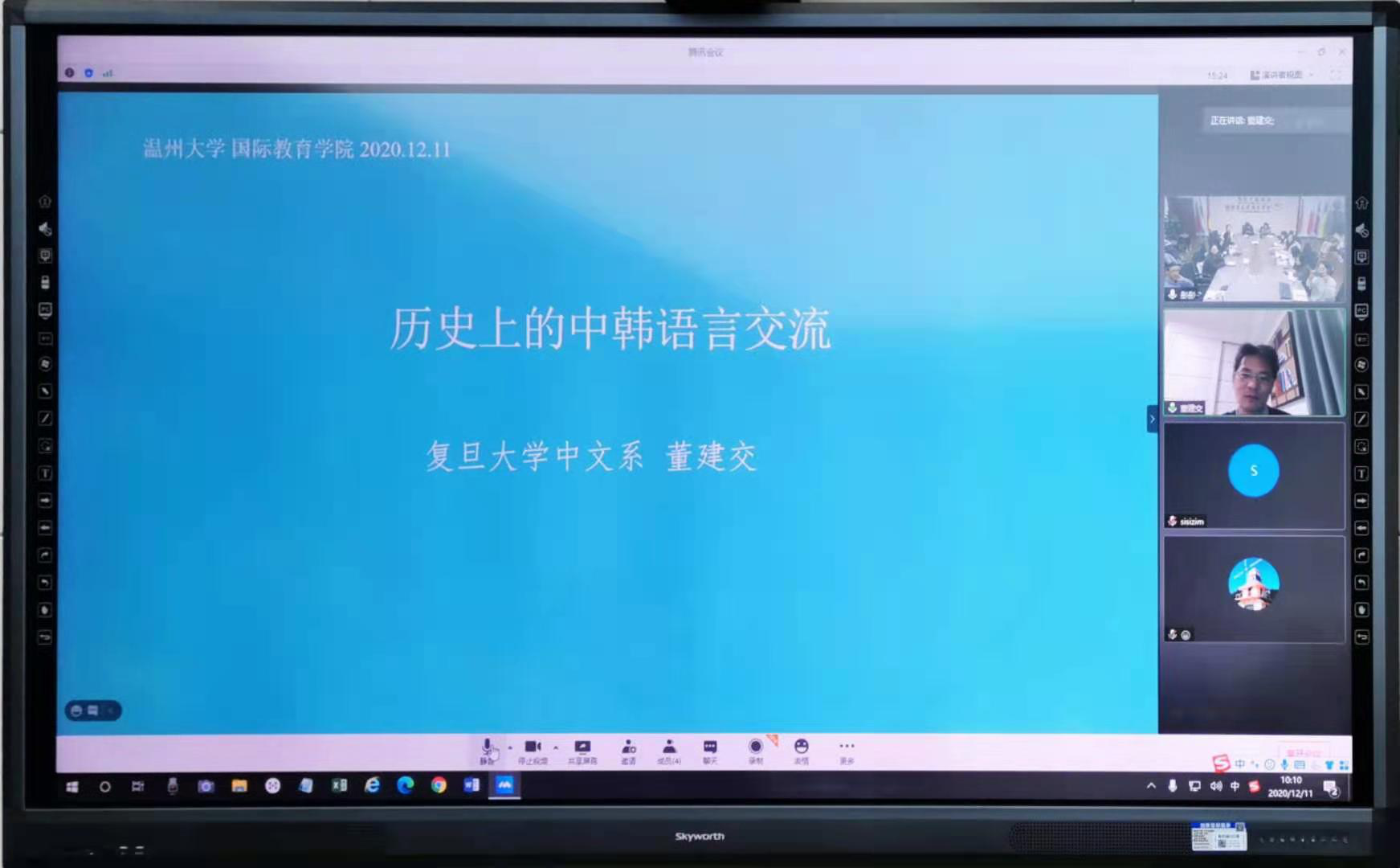 2020年12月11日上午10:00,复旦大学中文系董建交教授通过腾讯会议给我们带来了题为《历史上的中韩语言交流》的线上讲座。yl6809永利官网叶苗院长、林爱菊书记、吴之欧副院长,部分专任教师及2020级汉语国际教育专硕点全体学生参加了这场讲座。讲座由专任教师叶晓锋博士主持。
