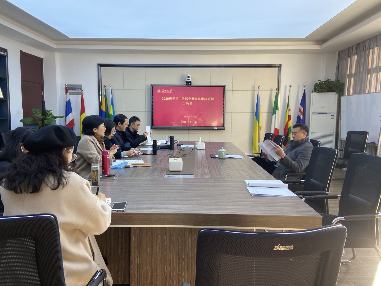 1月14日上午,yl6809永利官网领导班子在国际楼311会议室召开2020年下半年党风廉政分析会暨意识形态分析会和班子民主生活会。学院领导班子成员参加会议,会议由党总支书记林爱菊主持。校党委委员、副校长薛伟莅会指导。