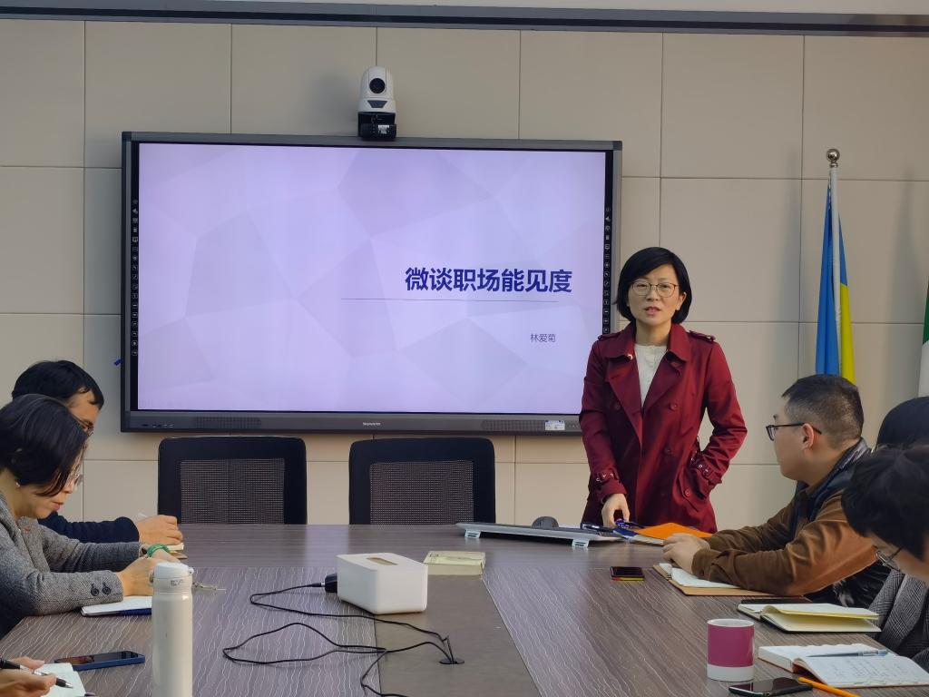 3月24日,yl6809永利官网全体行政人员在311开展第5期“国教微享会”活动,分享的主题为“如何提高职场能见度”,学院党总支书记林爱菊主讲。
