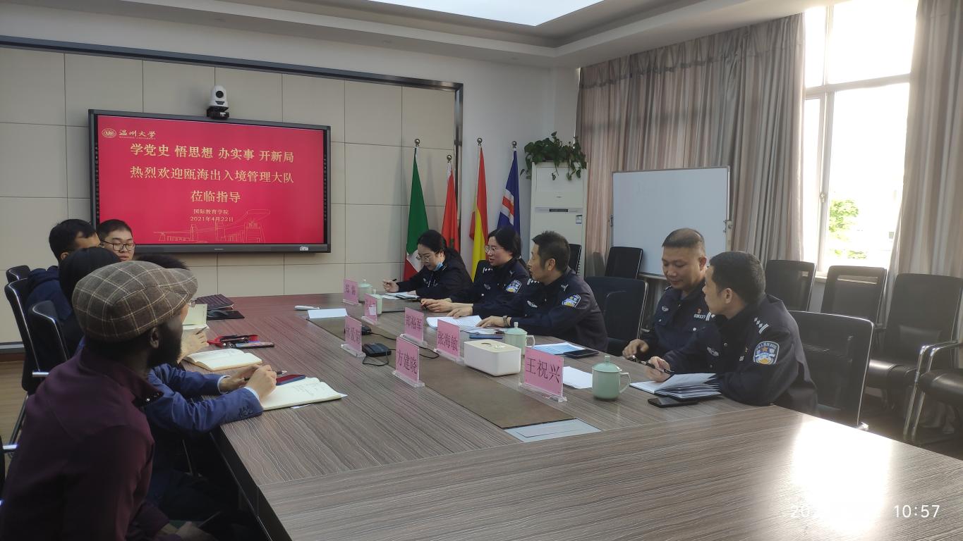 4月23日上午,瓯海区公安局副局长郑裕军、瓯海区出入境管理大队大队长张海敏、王祝兴、陈小菲、郑剔警官一行来永利官网开展交流指导。yl6809永利官网党总支书记林爱菊、副书记方建晓、学生科全体辅导员参加了本次交流。