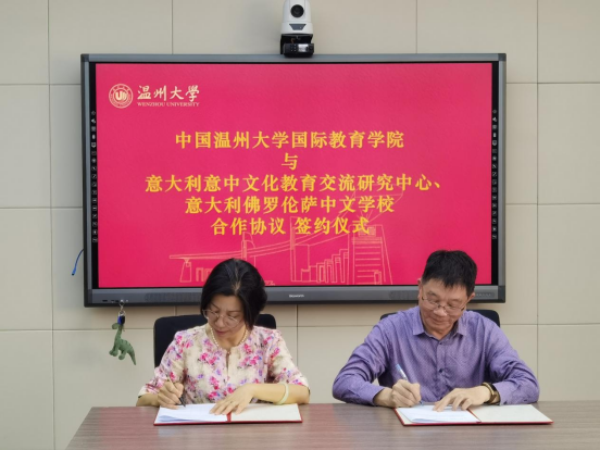潘世立校长详细介绍了意大利佛罗伦萨中文学校的基本情况、当前全球疫情影响下的教学形式,以及接下来一年的教学工作安排。他还提出了对此次合作项目及参与师生的一些希望和要求,同时也表达了对温大学子及教学质量的信任。最后,双方签订合作协议并交换协议书。
