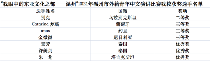 附:“我眼中的东亚文化之都——温州”2021年温州市外籍青年中文演讲比赛我校获奖选手名单