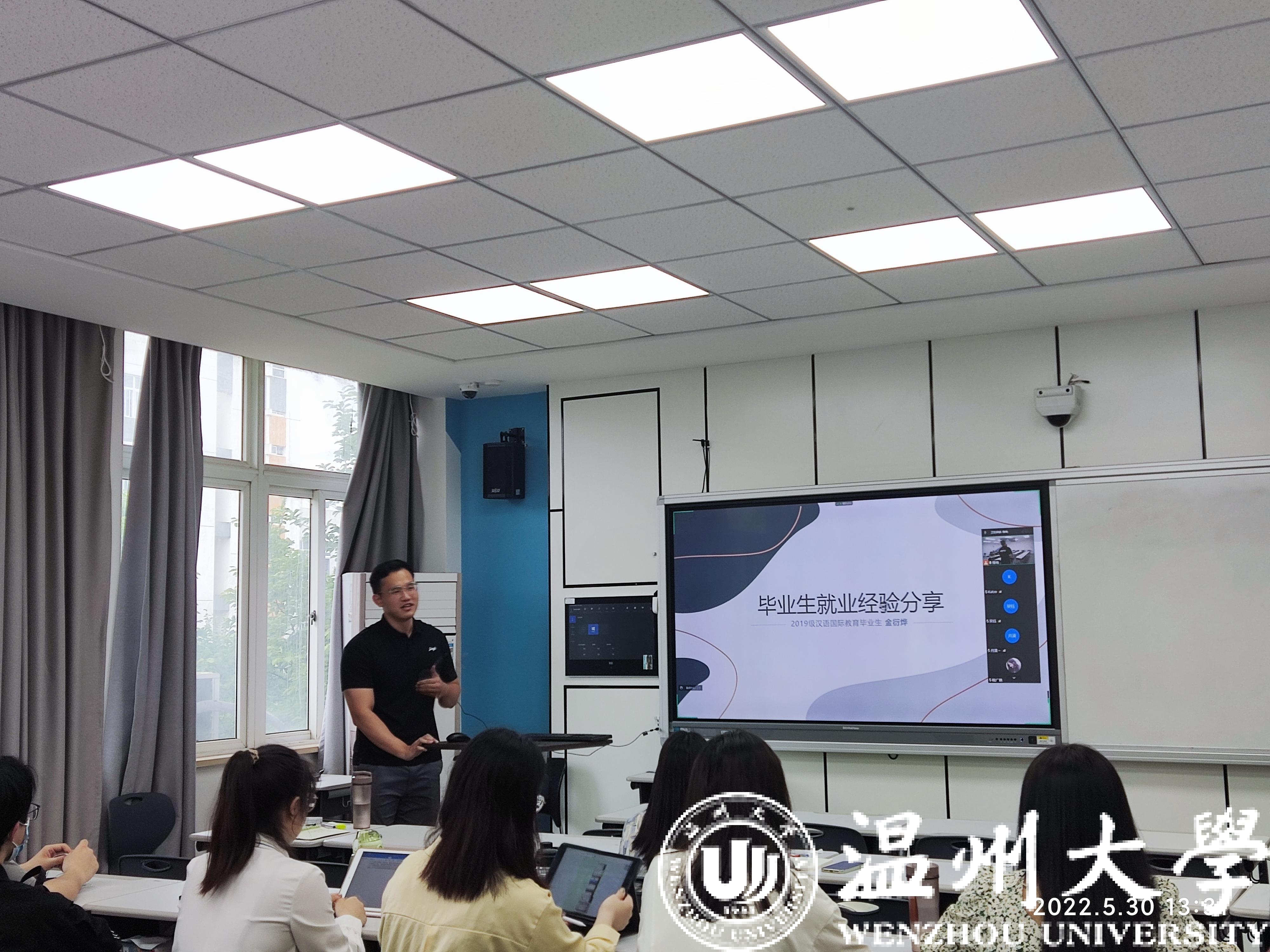 为提升国际中文教育专业学生就业能力,加强对研究生就业指导与帮扶,2022年5月30日下午,yl6809永利官网第二期“朋辈引领计划”讲座以线上线下相结合方式成功举办。2019级优秀毕业生金衍烨应邀为全体研究生作高校行政岗求职经验分享。辅导员吴铨铨、20级、21级研究生参加了本次讲座。