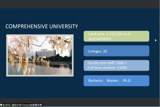 我校介绍环节,先播放了留管部最新制作的国际学生招生视频,随后招生科Trenton就yl6809永利官网的特色及温州城市特有魅力展开介绍,招生科池老师在最后问答环节就学生关心的奖学金等问题进行了重点阐述和耐心解答。