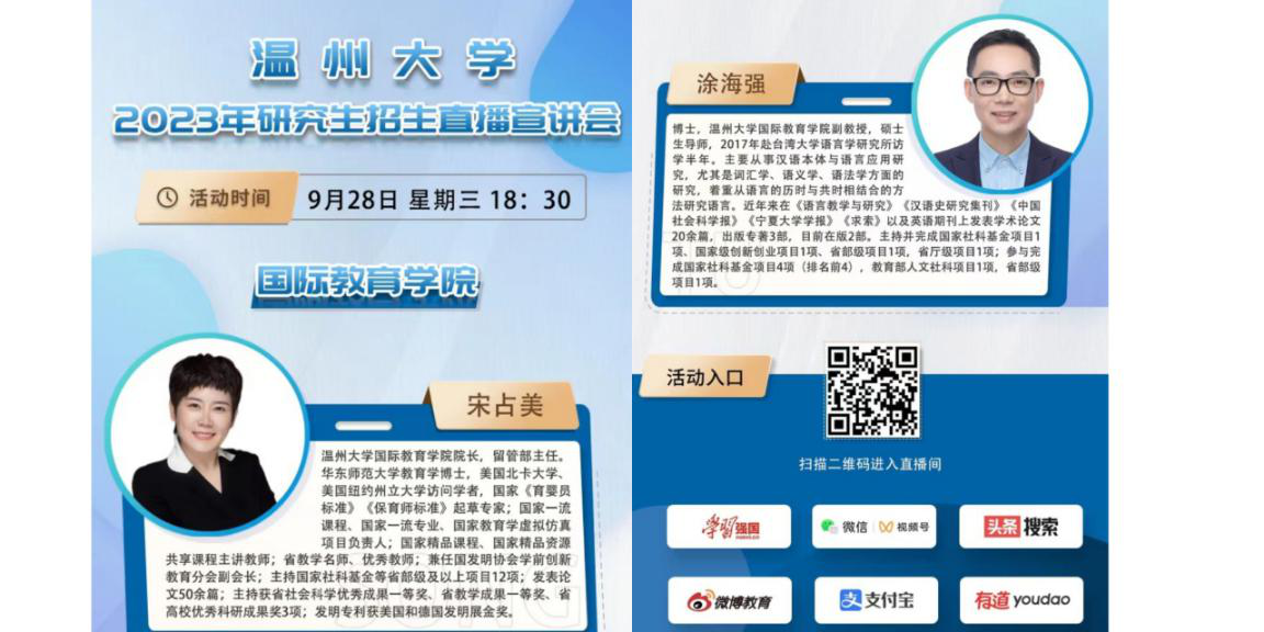 9月28日下午18:30,永利官网成功地举行了2023年研究生招生直播宣讲会。yl6809永利官网院长(留管部主任)宋占美、硕士生导师涂海强出席了本次宣讲会。宣讲会采用线上直播方式进行,直播活动通过中国教育在线考研频道、掌上考研公众号、全国研究生招生线上咨询群等中国教育在线官方平台全面推广,吸引了大量考研学子和家长观看,为永利官网2023年汉硕招生工作奠定了良好基础。