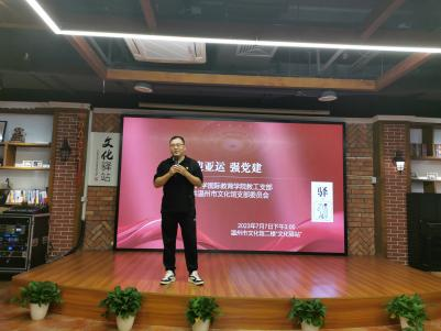 为推进学习贯彻习近平新时代中国特色社会主义思想主题教育走深走实,积极响应中共温州市委组织部开展“红七月·服务月”活动的倡议,7月7日,yl6809永利官网教工党支部组织开展了“迎亚运分享会暨与温州市文化馆党支部党建联建活动”。此次活动于温州市文化馆二楼“文化驿站”举行,yl6809永利官网教工支部党员、温州市文化馆党支部党员、温州市文化馆青年理论学习社成员等参与了活动。活动围绕“学思想、当先锋、促践行”的主题,结合亚运会保障工作等大事要事,学习传达近期习近平总书记在文化传承发展座谈会上的重要讲话精神。