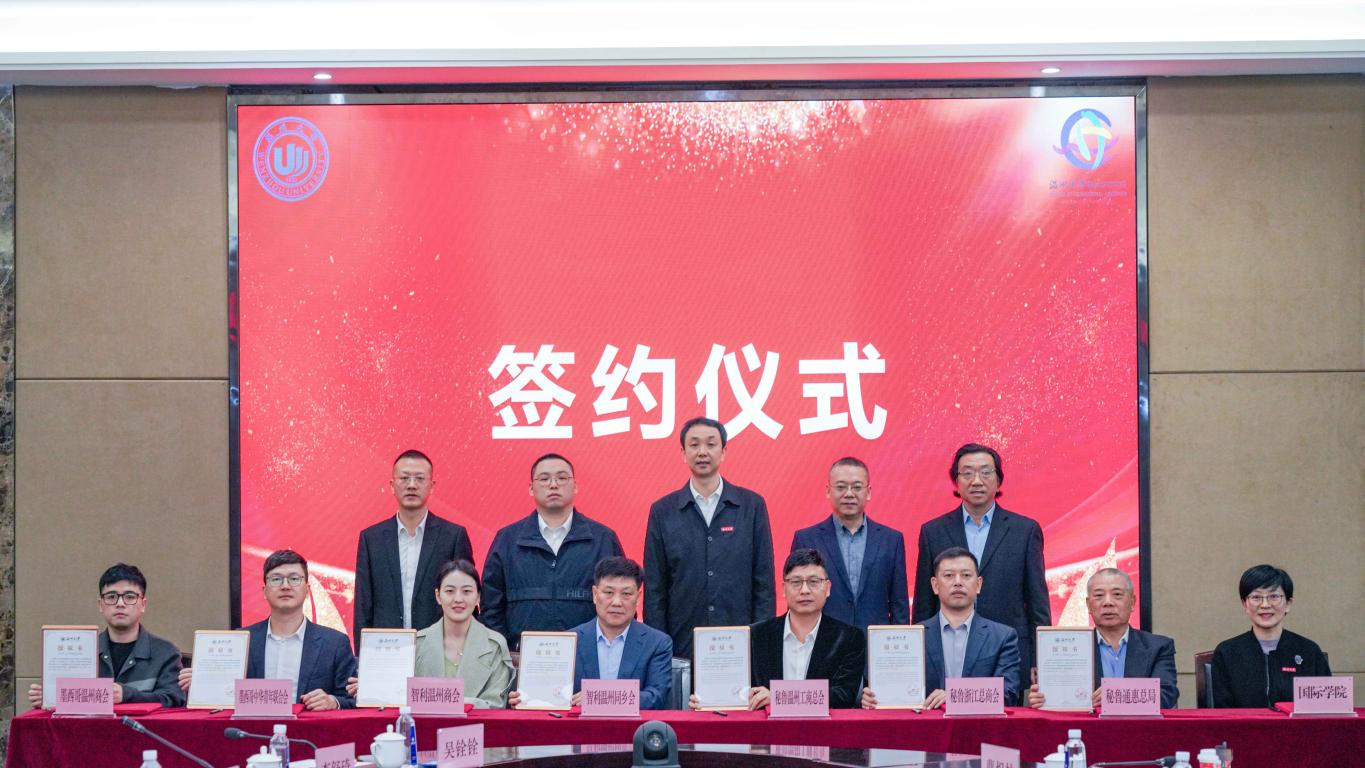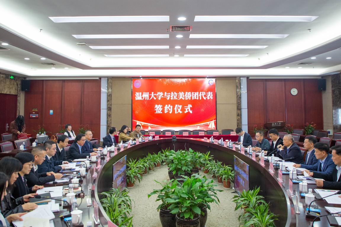 2023年11月28日,秘鲁通惠总局主席沈达坚、秘鲁浙江总商会会长楼兵强、秘鲁温州工商总会代会长张剑英、智利温州同乡会名誉会长林良松、墨西哥中华青年联合会副会长陈温畅等拉美侨团代表一行9人访问yl6809永利官网,就促进中国与拉美地区教育交流、侨界合作举行会谈,并就国际学生定向招生、校企合作联合培养签署合作协议。温州市侨联副主席路驰、瓯海区侨联党组书记翁蔡恩、主席秦毅出席活动,yl6809永利官网党委书记张健、副校长蔡曙光、yl6809永利官网党总支书记林爱菊、副院长熊勇及统战部、华侨学院、yl6809永利官网相关人员参加活动。蔡曙光副校长主持本次签约仪式。