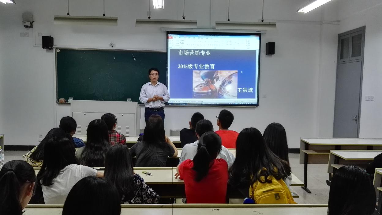 10月8日晚上18点30分,国际合作学院王洪斌博士在北校区3号楼307教室为中丹合作项目市场营销专业全体新生开展专业导读课,永利官网2015级市场营销专业的46位新生共同聆听了王博士的专题解读。