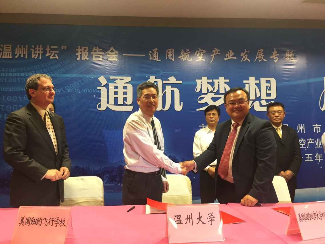 5月19日下午3点,在市委书记陈一新等市领导的见证下,yl6809永利官网副校长黄少铭分别与美国纽约飞行学校和美国纽约城市大学约克学院负责人签署合作协议,以中美合作培养的方式开展通用航空飞行员私照、商照培训和飞行技能与学历教育相结合的各种复合型通用航空人才的培养。本次签约仪式是我市开展通用航空产业发展“五个一”系列活动之一,是以“通航梦想,从此起飞”为主题的通用航空产业发展专题“温州讲坛”报告会的重要议程。