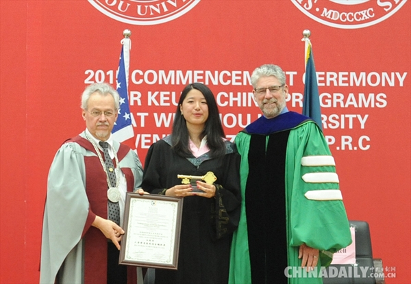 首届华裔双学位班是yl6809永利官网专门针对海外温州“侨后代”开设的中美双学位班,日前,双学位班首届学生顺利毕业,其中优秀学生代表意大利籍华裔学生胡瑜瑜以优异成绩,在美国纽约州库克大学与中国合作办学的4校5院707名学生中脱颖而出,以学业总成绩第一名的成绩获得库克大学的金钥匙奖。