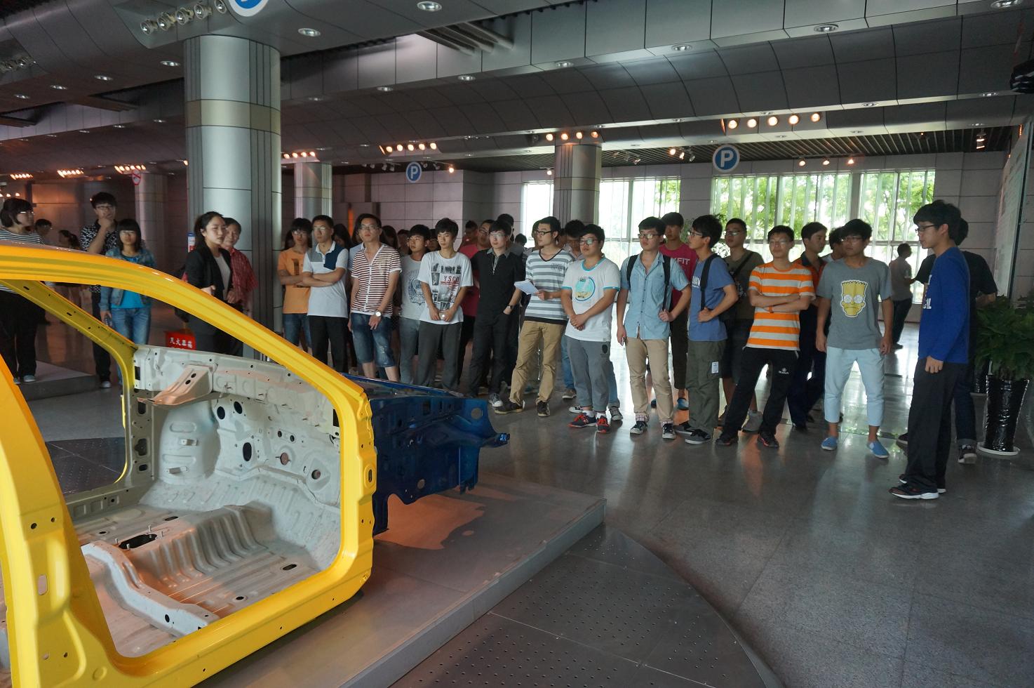 本次活动的第二站为吉利控股集团宁波分公司。在吉利员工的带领下,同学们首先参观了吉利旗下的全球鹰,英伦、帝豪等车型;然后又聆听了吉利公司发展历程以及生产流程介绍,从理论与实际层面全面了解了零件生产、整车组装和质量检测等汽车制造流程。
