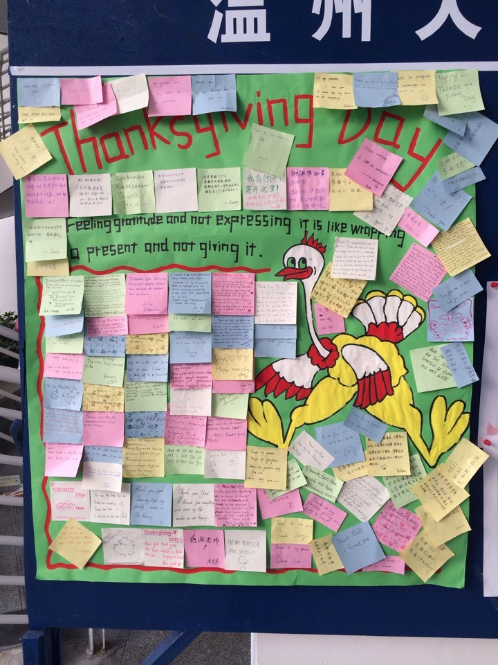 在一年一度的感恩节到来之际,国际合作学院团委学生会发起了“浓情感恩节,深悟感恩情”祝福语征集活动。全院中外同学们纷纷响应,积极参与,将自己对同学、朋友以及亲人的感谢与祝福写下。感恩海报上贴满制作精美的用各国语言写作的祝福语。值得一提的是部分留学生们用端正的中文字写出了感谢,中国学生则用地道的英文表示了感谢之情。五颜六色、精美别致的小纸片随风飘展,成为学院冬日里一道亮丽的风景线。
