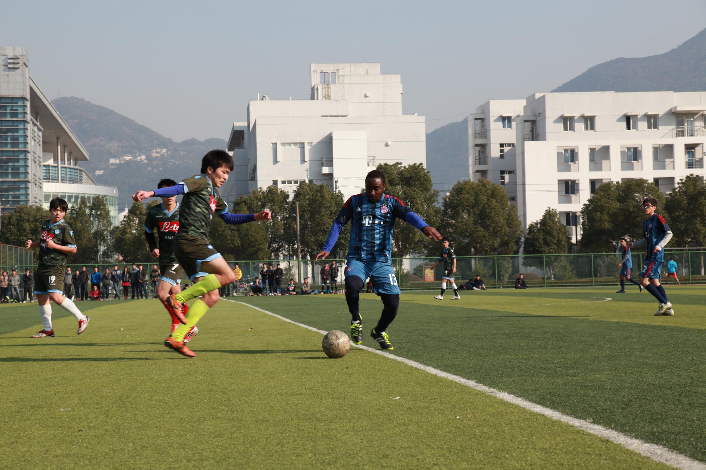 yl6809永利官网2013年“金秋杯”足球赛决赛于12月末在北校区足球场举行。比赛在国际合作学院与瓯江学院之间展开,两院队伍都是经过激烈角逐挺进决赛。国际合作学院的“联合国足球队”由中国、泰国、尼日利亚、加纳等国家学生组成,赛场旁围满了前来观战的球迷,全场热情高涨。