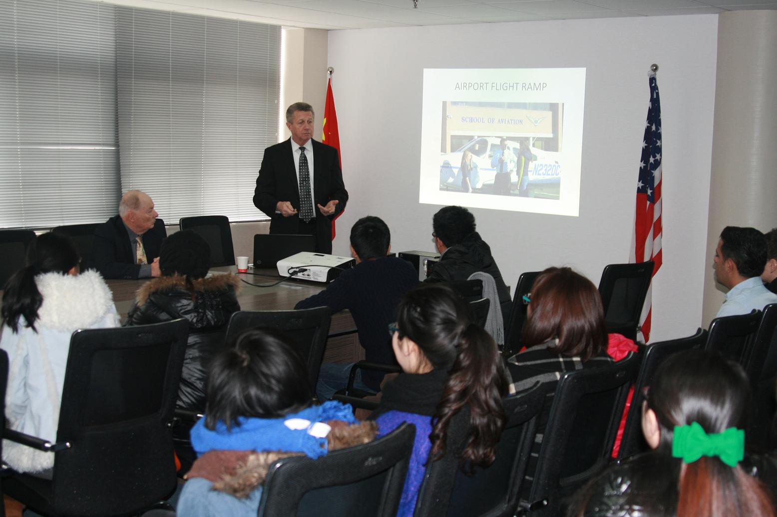为促进低空飞行领域开发、满足市民对私人航天飞行的需求,通过航空港建设带动相关产业及其创新,进而刺激温州经济发展,此次yl6809永利官网特邀美国著名的航空学校道林大学前来访问。副院长 Thomas Daly与航空飞行教授James Record向我校师生们展示了其数十年从事飞行和飞行教学的经历,美国道林大学优越的教学环境(包括学校机场),并告诉学生们如何达成梦想。两位教授的介绍让在座的师生不禁流露出惊奇与羡艳,并在其后争相恳请签名、合影留念。