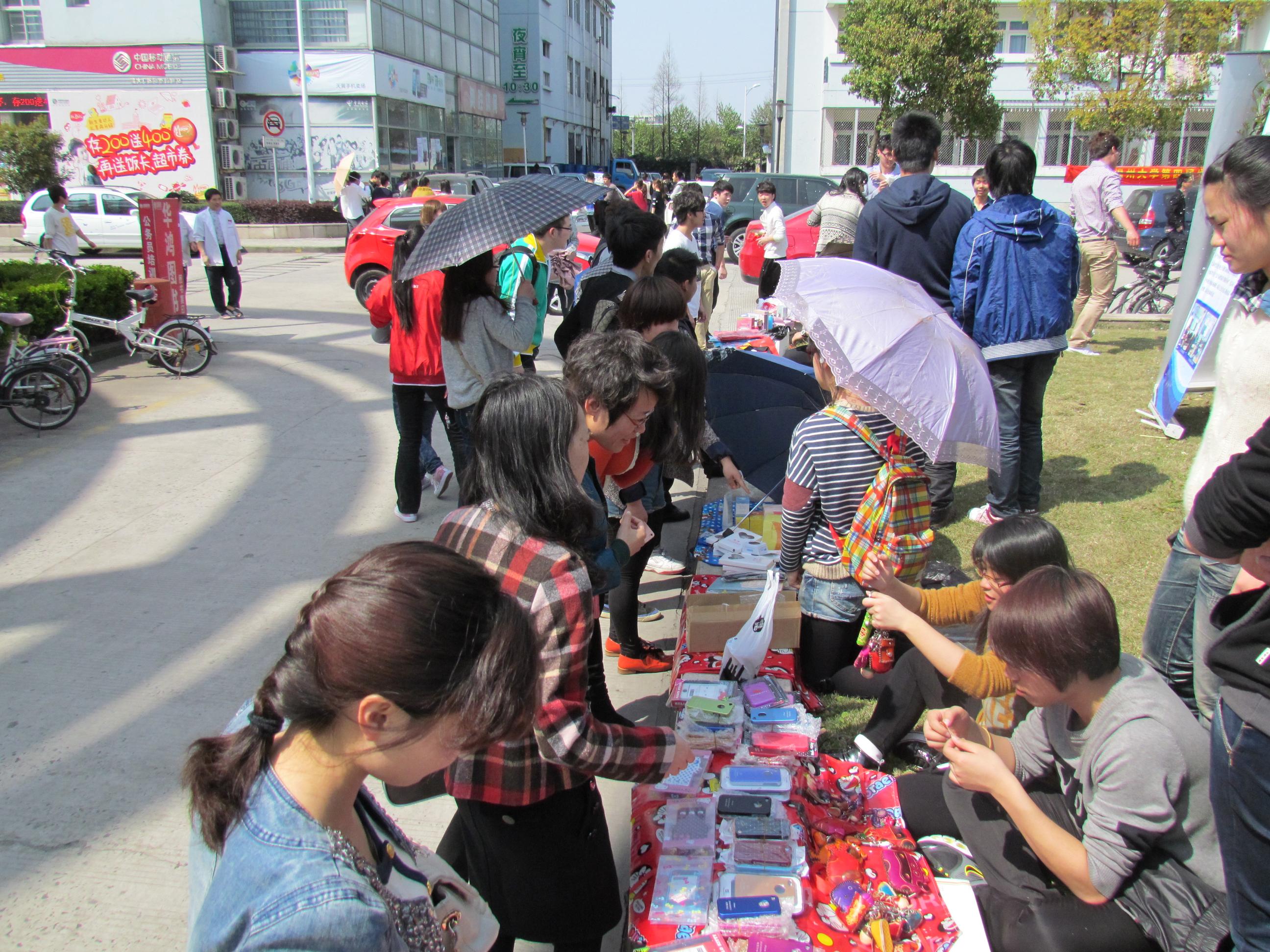 ,各司其职,挂起横幅,摆好宣传图片,并给各个小组划分好“摊位”。各小组在各自摊位上面摆满了各色“宝贝”:卡通文件夹、炫彩太阳伞,钥匙扣、手机链,面膜等等,几乎是琳琅满目,应有尽有。
