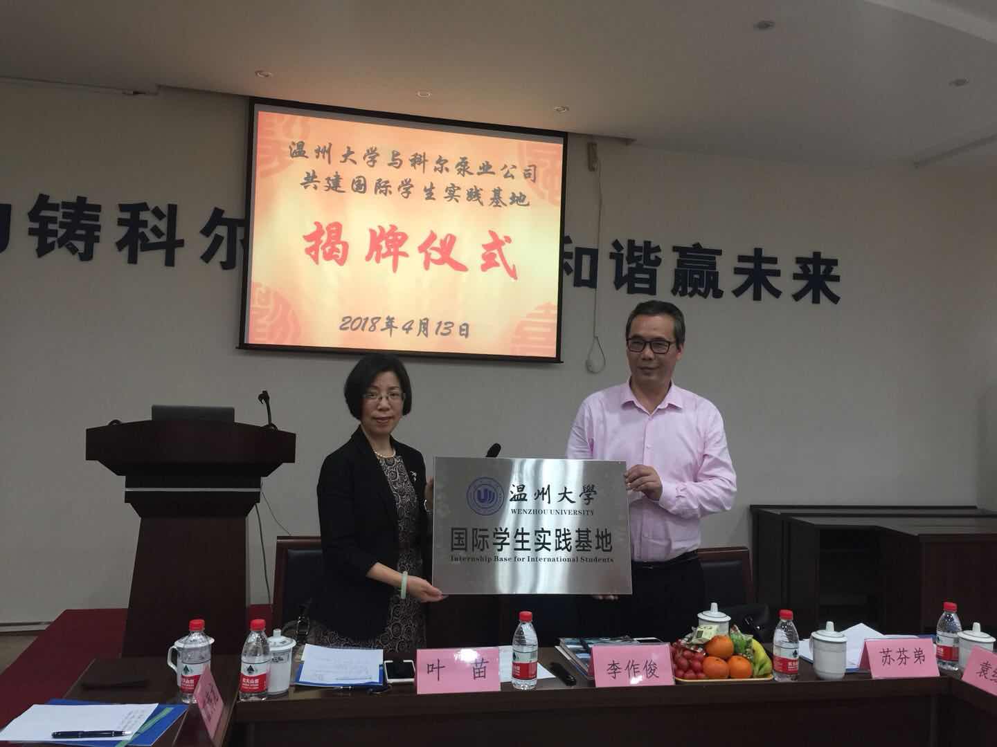 2018年4月13日,yl6809永利官网(留管部)师生赴瑞安,与浙江科尔泵业股份有限公司签订协议,携手共建yl6809永利官网国际学生实践基地。yl6809永利官网(留管部)院长兼书记叶苗教授、党总支副书记陈文远、学生科陈康豪、程玲老师及来自3个专业、9个国家的国际学生代表出席,科尔泵业股份有限公司董事长兼总经理李作俊,瑞安市人力资源和社会保障局党委副书记、副局长苏芬弟及相关负责人参与揭牌仪式。