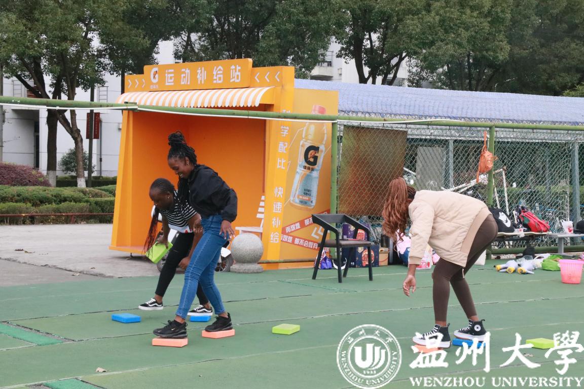 趣味运动会分跳绳比赛、摸石过河、夹糖大战三个个人项目,以及躲避球、心心相印两个团体项目。其中夹糖大战和摸石过河最为有趣,师生们两人一组比赛用筷子夹糖,在一分钟之内夹糖数量最多的一方获胜。比赛迎来了许多师生的围观,大家都想看看中国学生、老师获胜,还是不熟悉使用筷子的留学生获胜。虽然留学生最后没能获得第一名,但是很多留学生选手的夹糖数量依然超过60个,距离第一名仅差几颗糖。摸石过河也是学生积极参与的项目之一,每位参赛者脚底放置两块砖头,参赛选手听到裁判员发出“开始”口令后开始行动,提起左脚并拿起砖头放置前方,随后右脚提起并将右脚下砖头放置前方,如此往复,用时最短的一组获胜,师生们都纷纷铆足了劲往前冲。